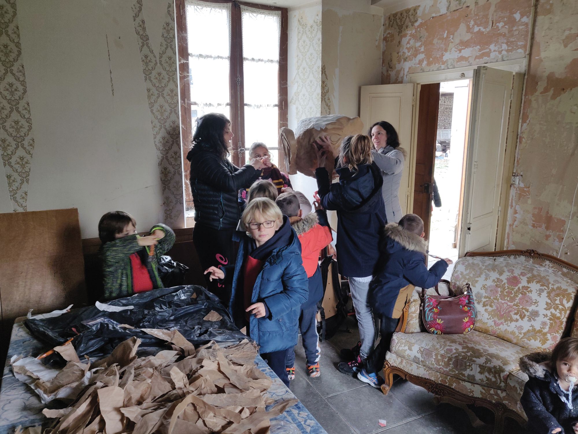 Adolescents, mainats e parents que tribalhèn entà hèr vàger eth permèr gigant d’Ibòs — un Pèpi* per segur! — dab materiaus de recuperacion.