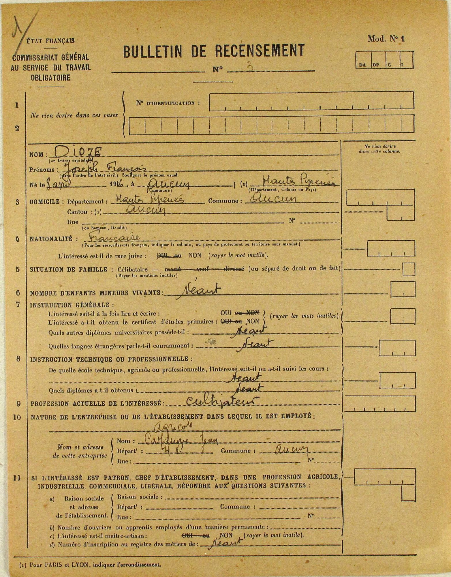 C’est dans ce contexte qu’un décret en date du 27 octobre 1940 rend obligatoire la carte d’identité de Français pour les individus âgés de plus de 16 ans. Pour cela, un fichier de référencement est mis en place, fruit de la collaboration entre les services centraux du ministère de l’Intérieur, les préfectures et l’administration communale. Moyen d’identification, le fichier nécessaire à l’établissement des cartes d’identité est aussi un outil d’exclusion : la mention du mode d’acquisition de la nationalité ainsi que la qualité de « juif » permettent en effet de recenser et de rejeter les individus qui ne répondent plus aux nouveaux critères nationaux et raciaux du régime. Les fiches sont établies en trois exemplaires : une par lieu de naissance et une par lieu de résidence. Les fichiers ouverts dans chaque préfecture devaient donner naissance à un grand fichier central national basé à Lyon, le 3eexemplaire des fiches étant prévu d’être adressé à ce service.