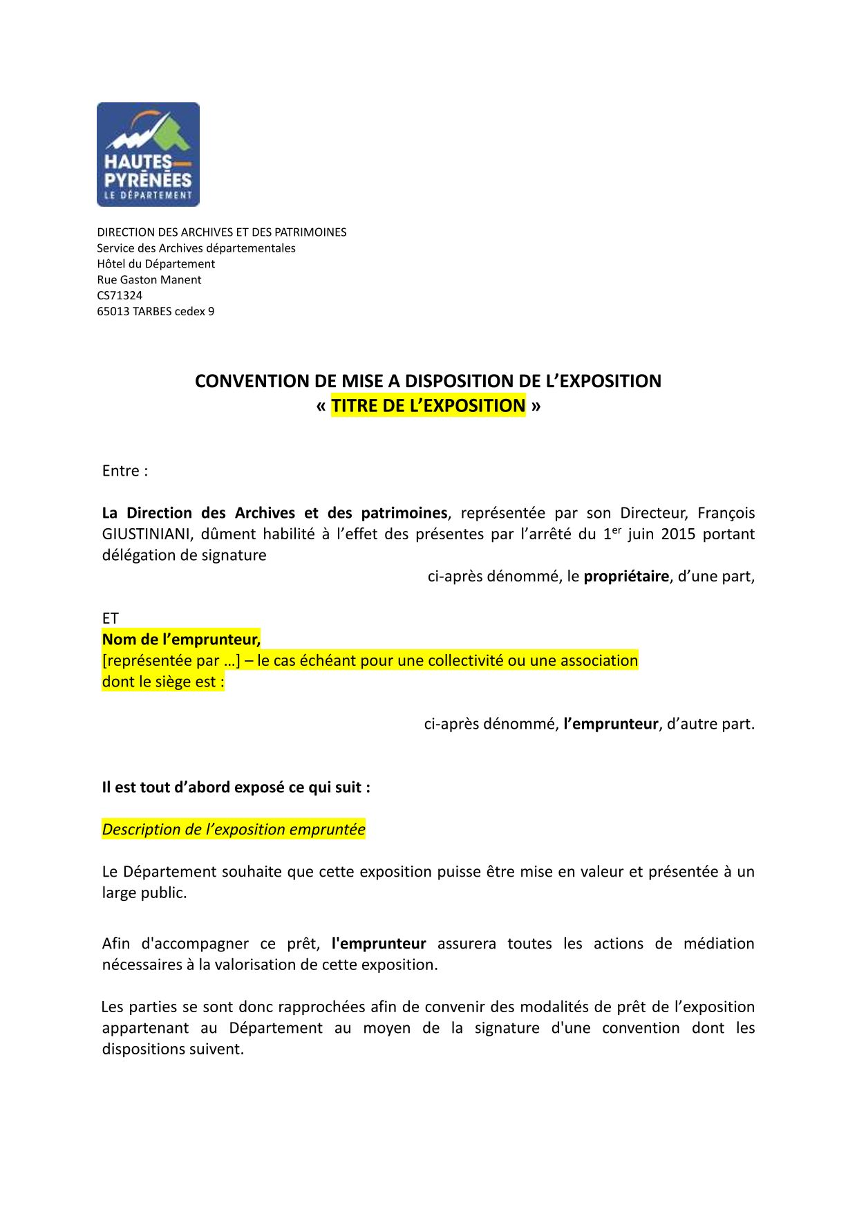 Le prêt des expositions proposées par la Direction des Archives et des patrimoines du Département des Hautes-Pyrénées est soumis à la signature d'une convention avec l'emprunteur. Celle-ci tend à préciser les conditions du prêt (durée, lieu d'exposition, valeur d'assurance...).