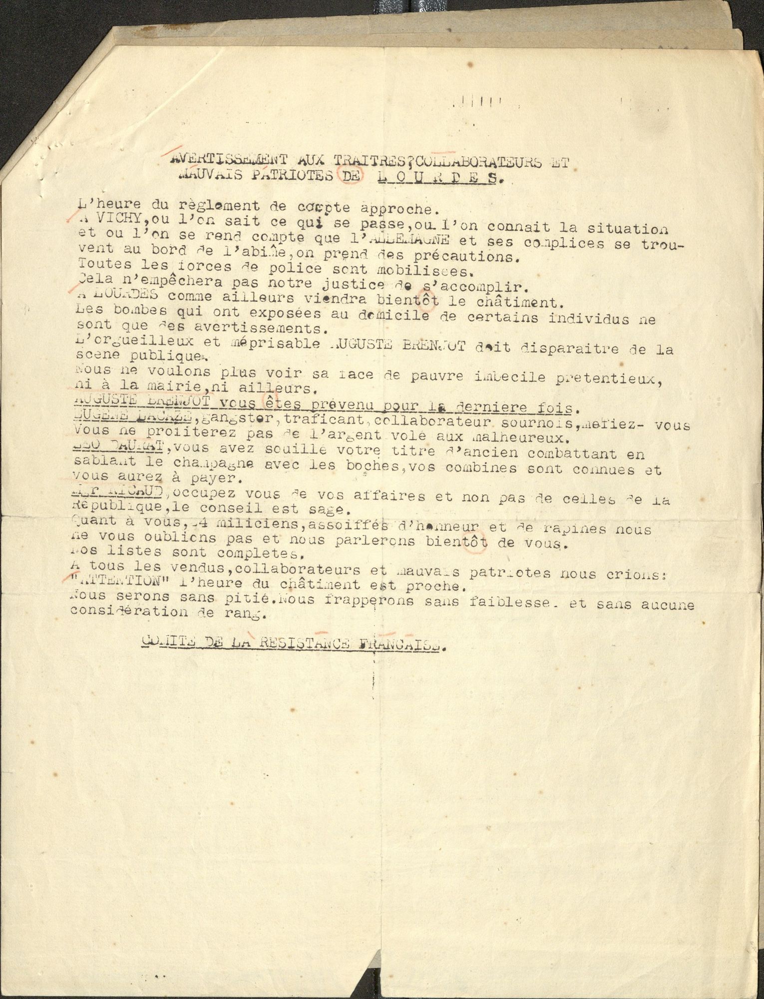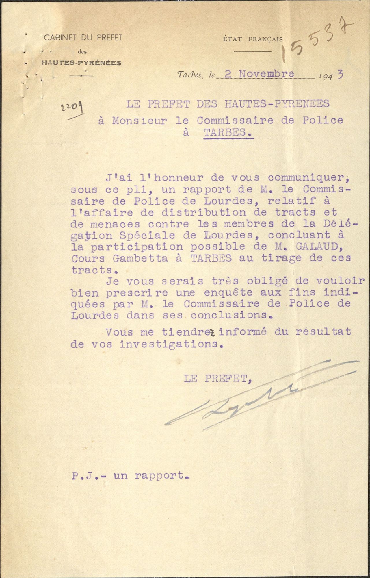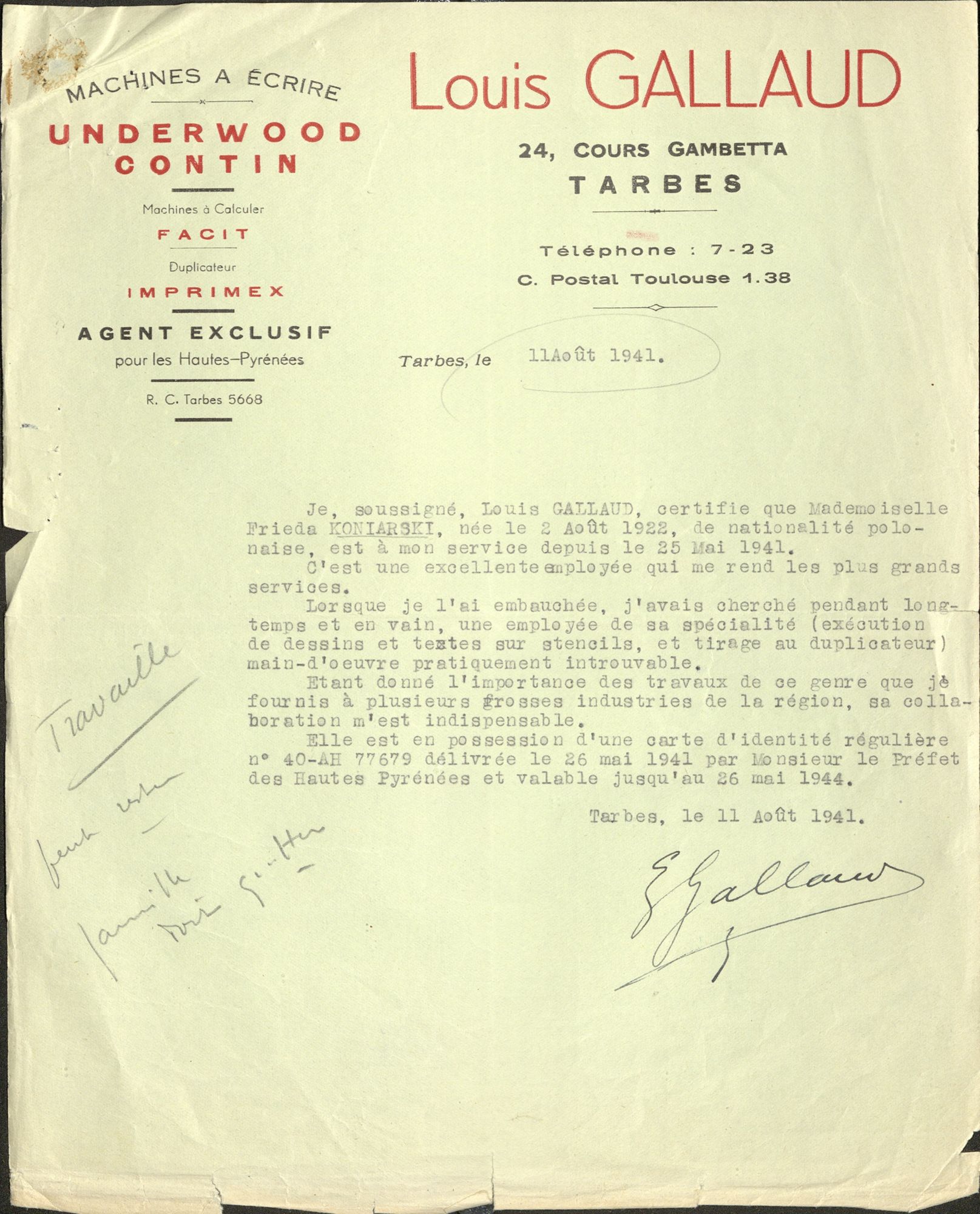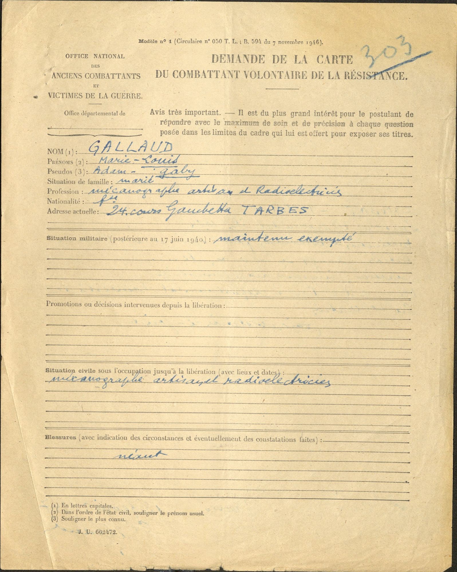 Militant socialiste et conseiller municipal d’opposition à Tarbes avant-guerre, Louis Gallaud (1901-1973) tient une entreprise de vente et de réparation de machines à écrire. Le local de son entreprise sert de base logistique pour des réseaux de la Résistance.