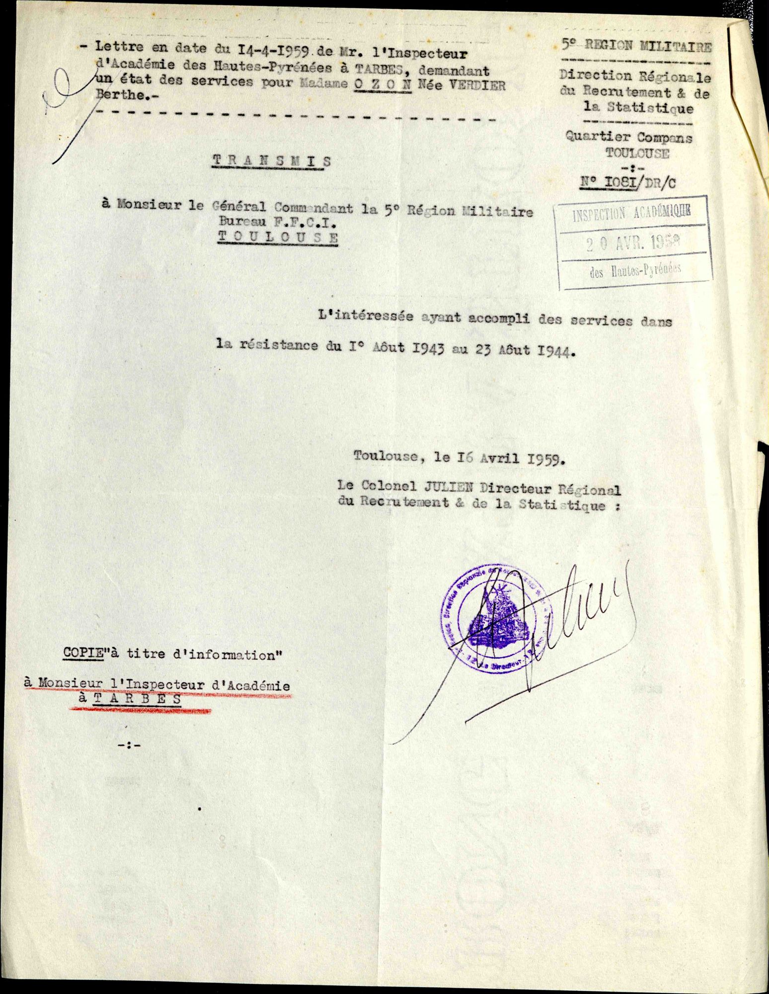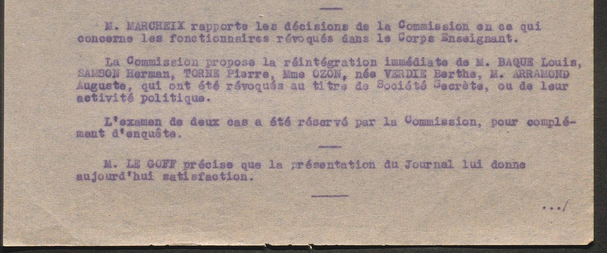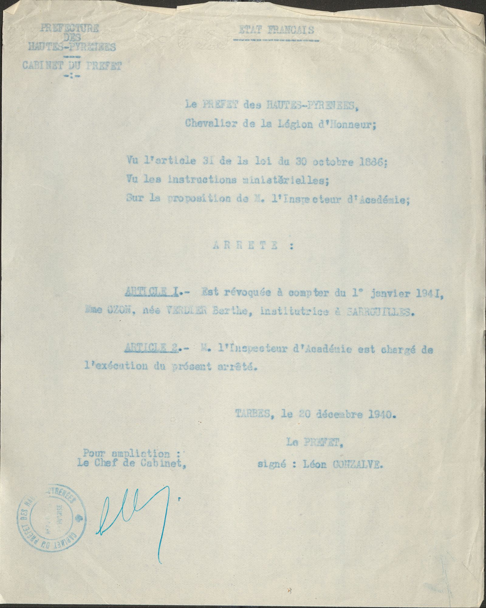 Berthe Ozon est révoquée comme un certain nombre d’instituteurs des Hautes-Pyrénées ; d’autres sont mis en retraite d’office ou déplacés d’office.