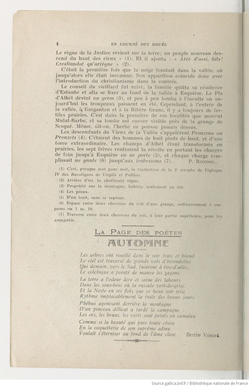 Femme de lettres, elle publie régulièrement des poèmes dans la revue bi-trimestrielle de la Société bigourdane d’entr’aide pédagogique, En cournè det houéc. Cette revue s’adresse au monde paysan des circonscriptions primaires de Bagnères-de-Bigorre et d’Argelès-Gazost afin de leur apporter de solides connaissances littéraires, scientifiques, pendant les veillées d’hiver.