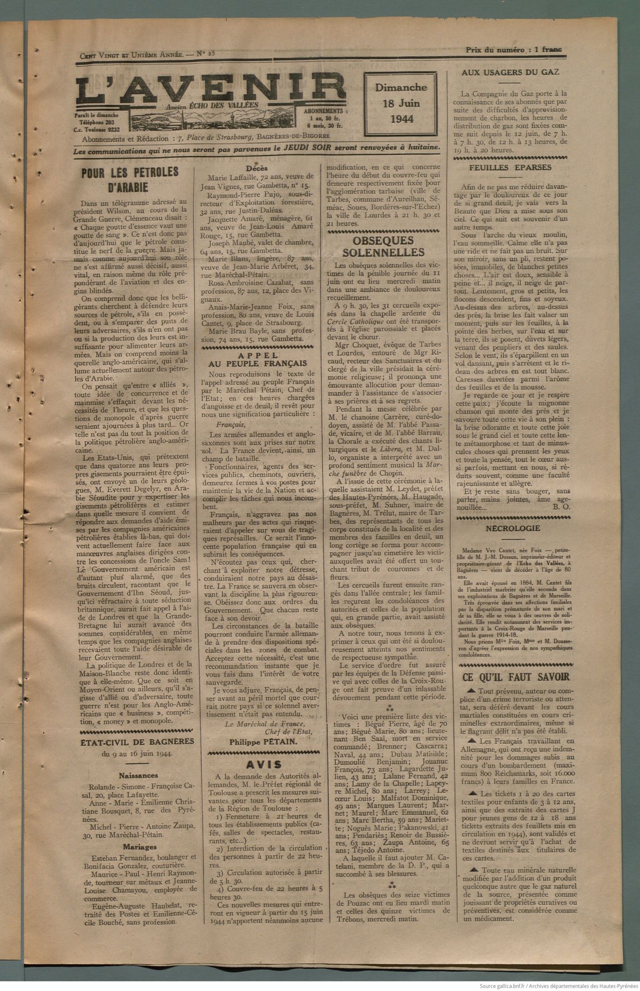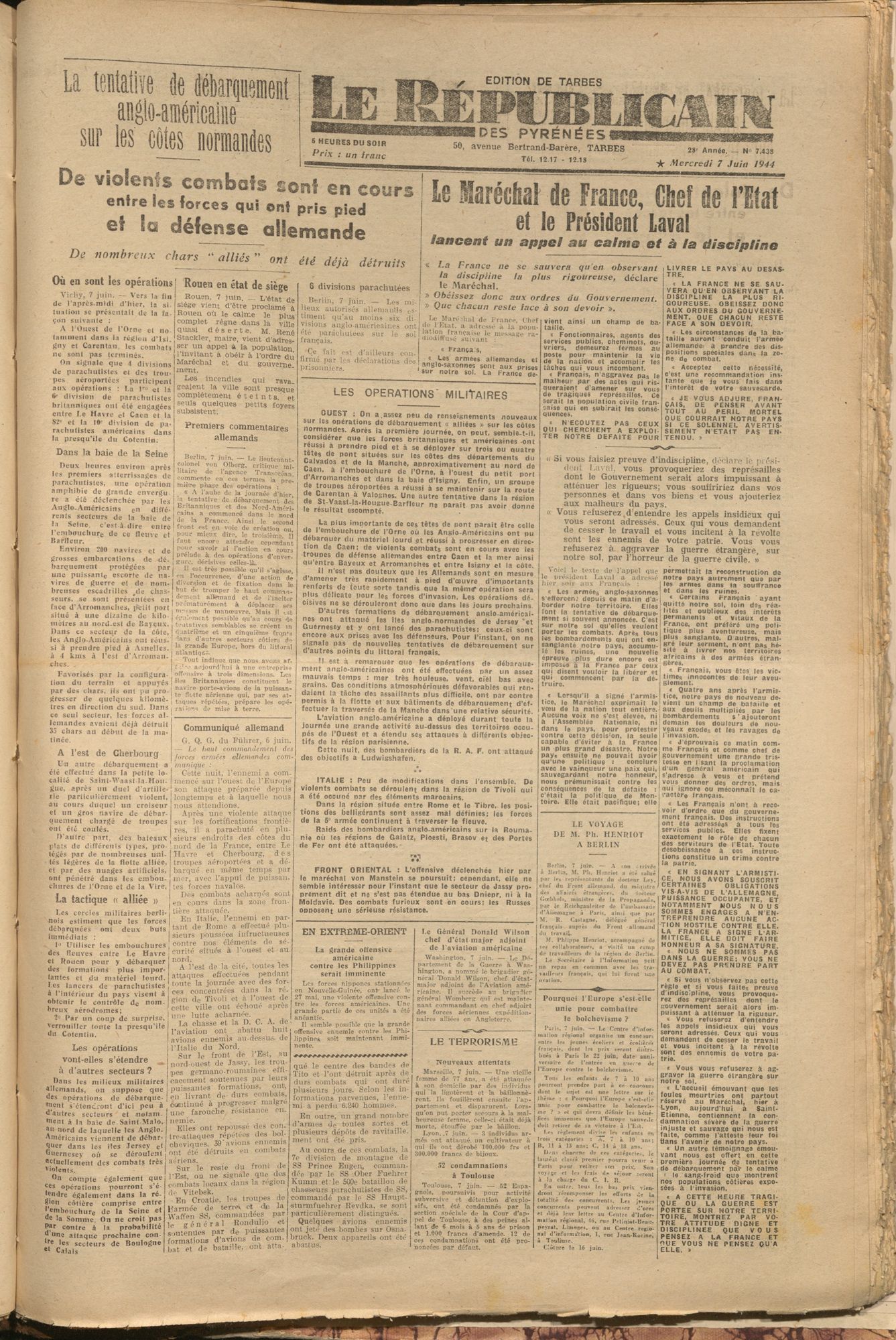 Le 6 juin 1944 laisse naitre l’espoir d’une Libération du territoire. Comme la presse nationale, le Républicain des Pyrénées transmet des informations partiales sur les combats en évoquant essentiellement la résistance des troupes allemande face à la tentative d’invasion des Alliés.