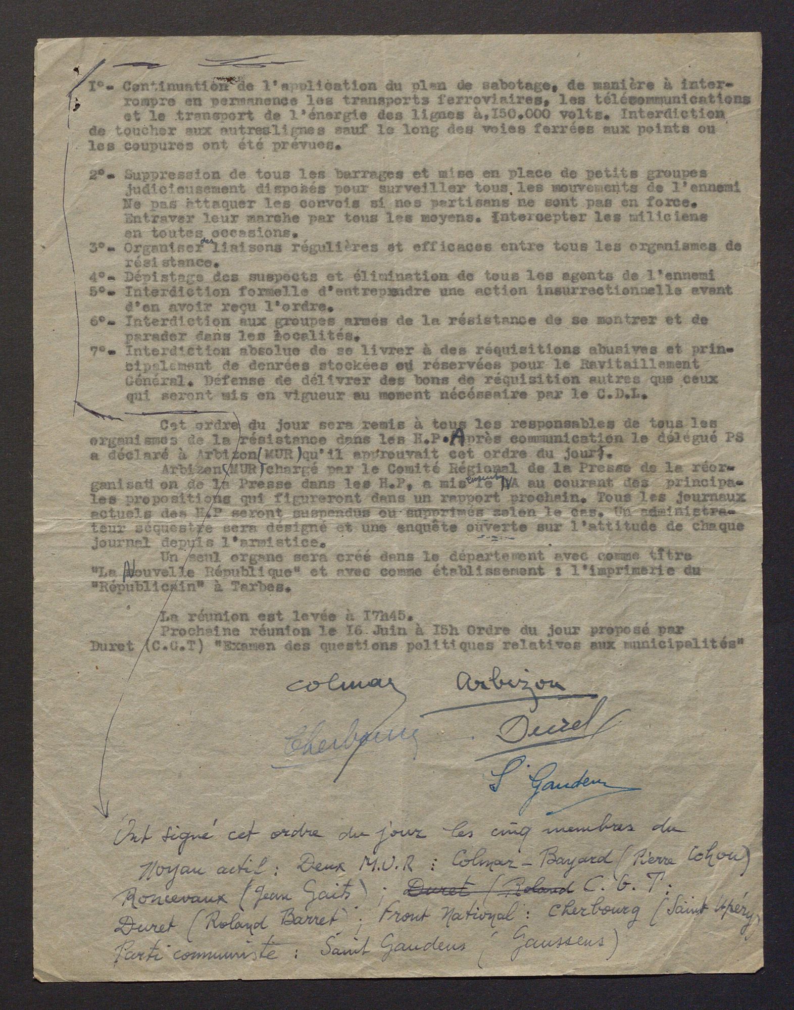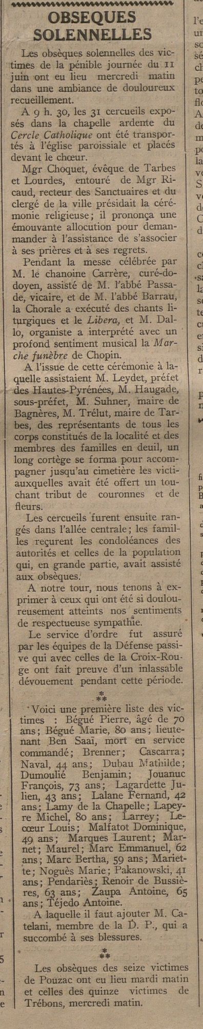 Cette journée est aussi évoquée dans un compte-rendu de la réunion du 12 juin du « noyau actif » du Comité départemental de Libération, constitué depuis le mois d’avril 1944 sous la présidence de Pierre Cohou, responsable des MUR (Mouvement Uni de la Résistance) dans les environs de Bazet près de Tarbes.