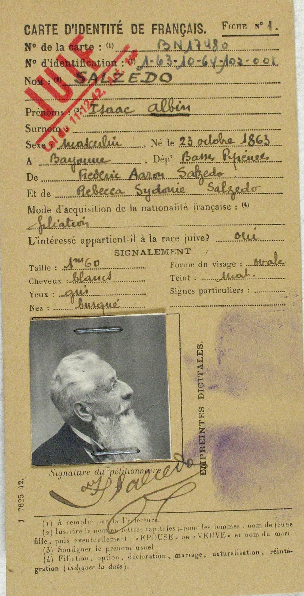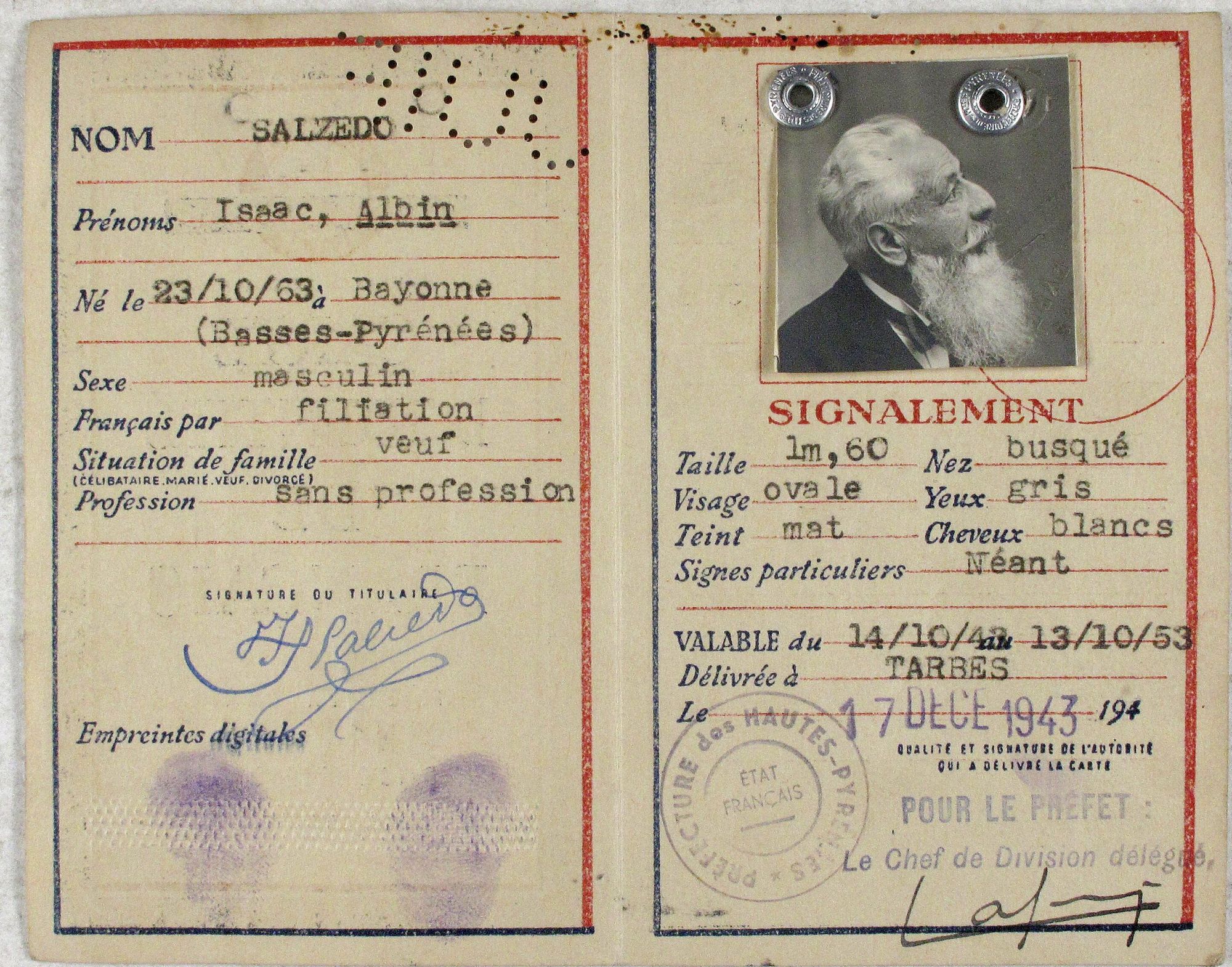 Une autre qui devait être délivrée à Albin Salzedo, décédé entre-temps, est marquée du poinçon « JUIF ». Témoignage de la stigmatisation des membres de cette communauté, cette carte est l’une des rares conservées au sein de ce reliquat.