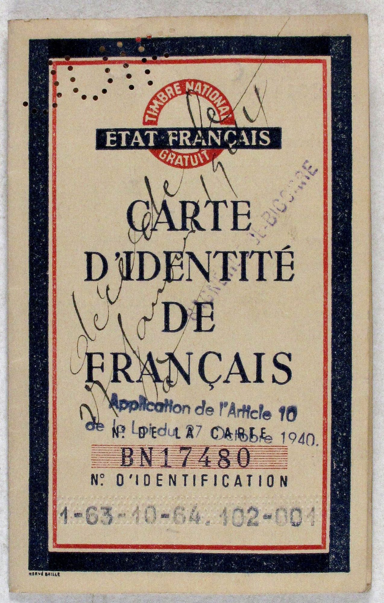 Par la loi du 27 octobre 1940 est instaurée la « carte d’identité de Français », ancêtre de notre carte nationale d’identité. Le Gouvernement de Vichy trouve ainsi un moyen d’identification de tous les Français de plus de 16 ans.