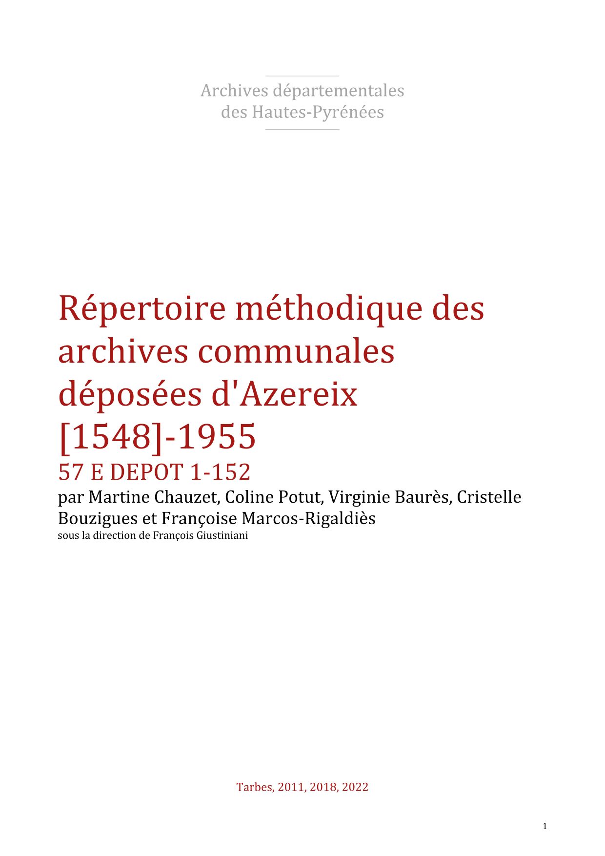 Azereix (v. 1200-1230, Cartulaires Bigorre ; 1285, Montre Bigorre).