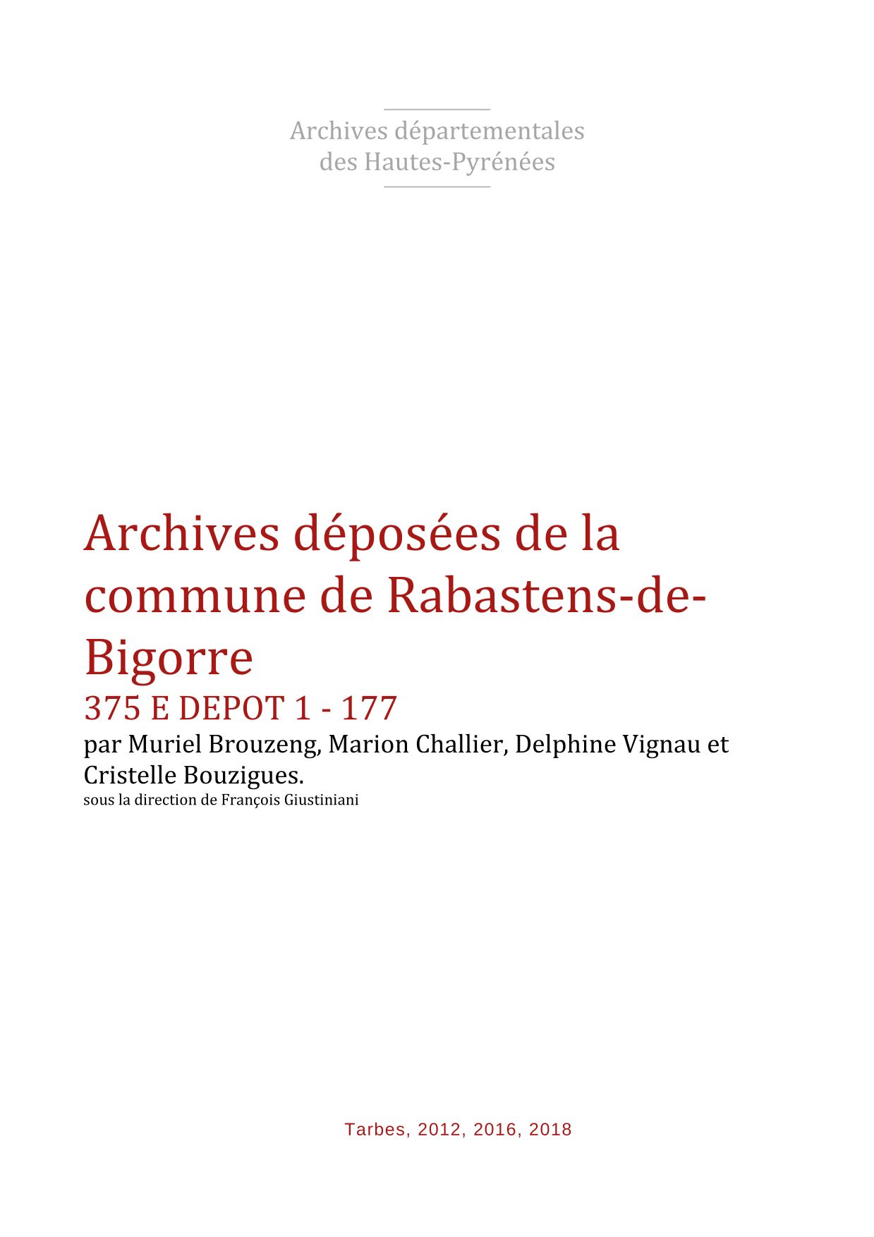 Historique administratif : Pays et sénéchaussée de Bigorre. Quarteron de Rabastens. Chef-lieu de canton depuis 1790. Escondeaux, quartier de Rabastens, commune en 1790, est rattachée à Rabastens entre 1791 et 1801, puis érigée en commune en 1845. Rabastens prend en 1962 le nom de Rabastens-de-Bigorre. |