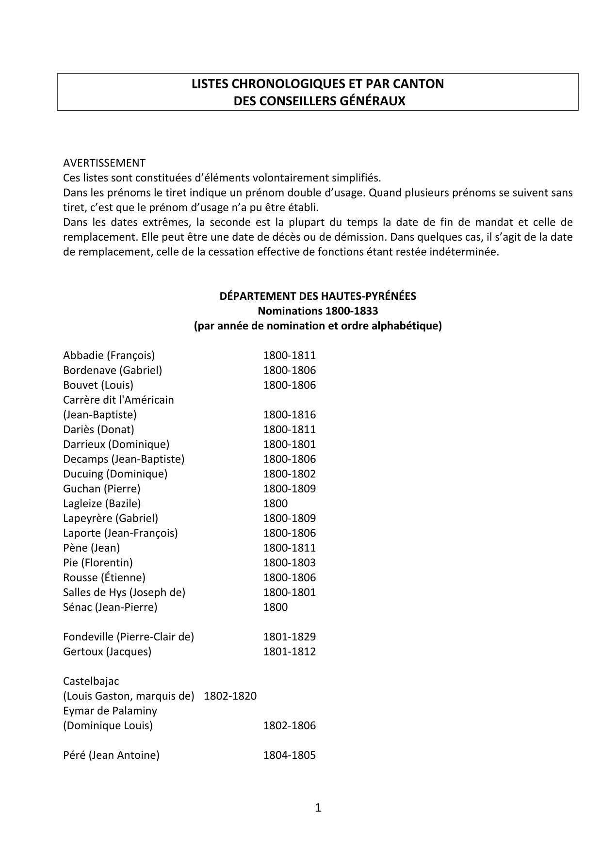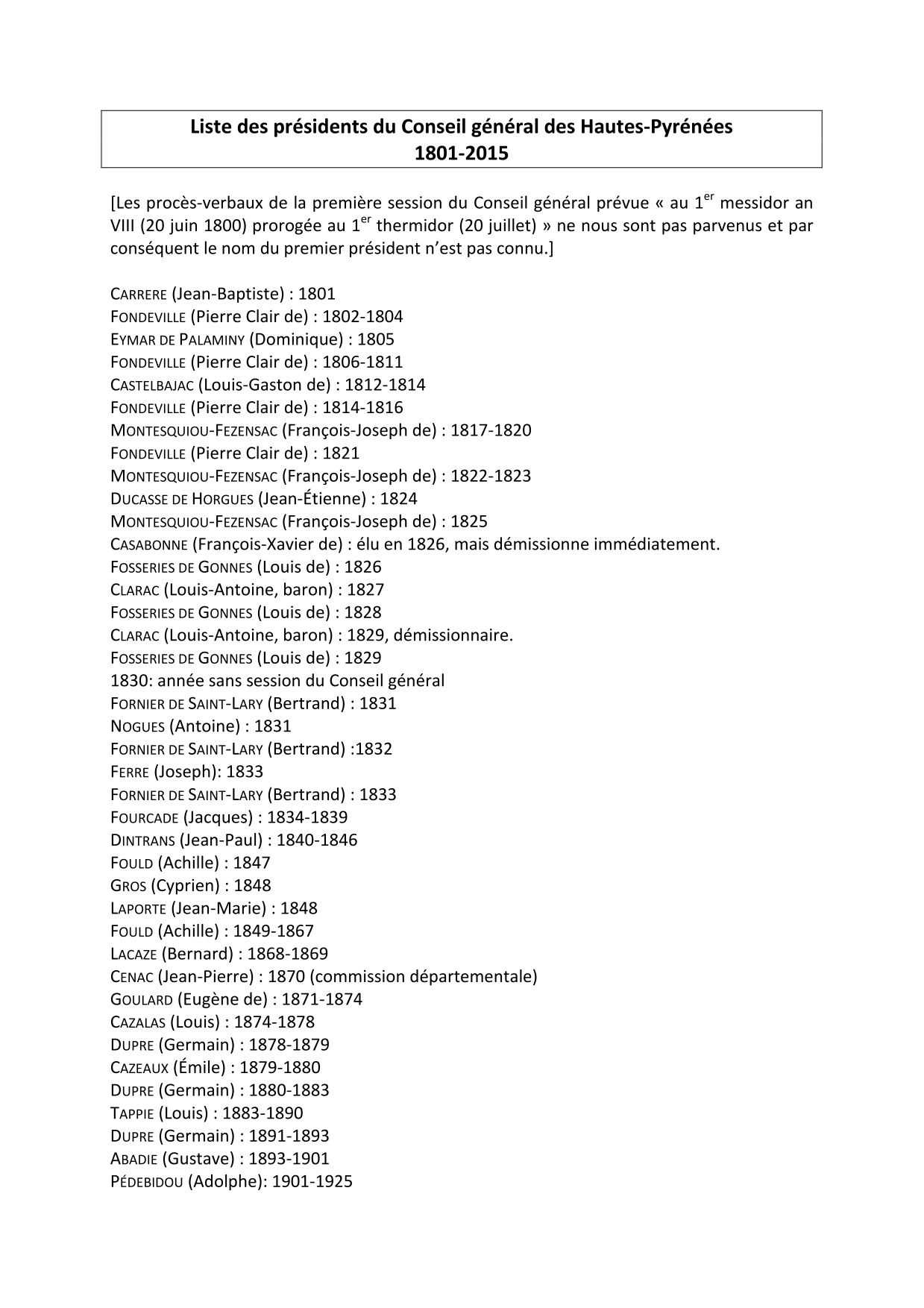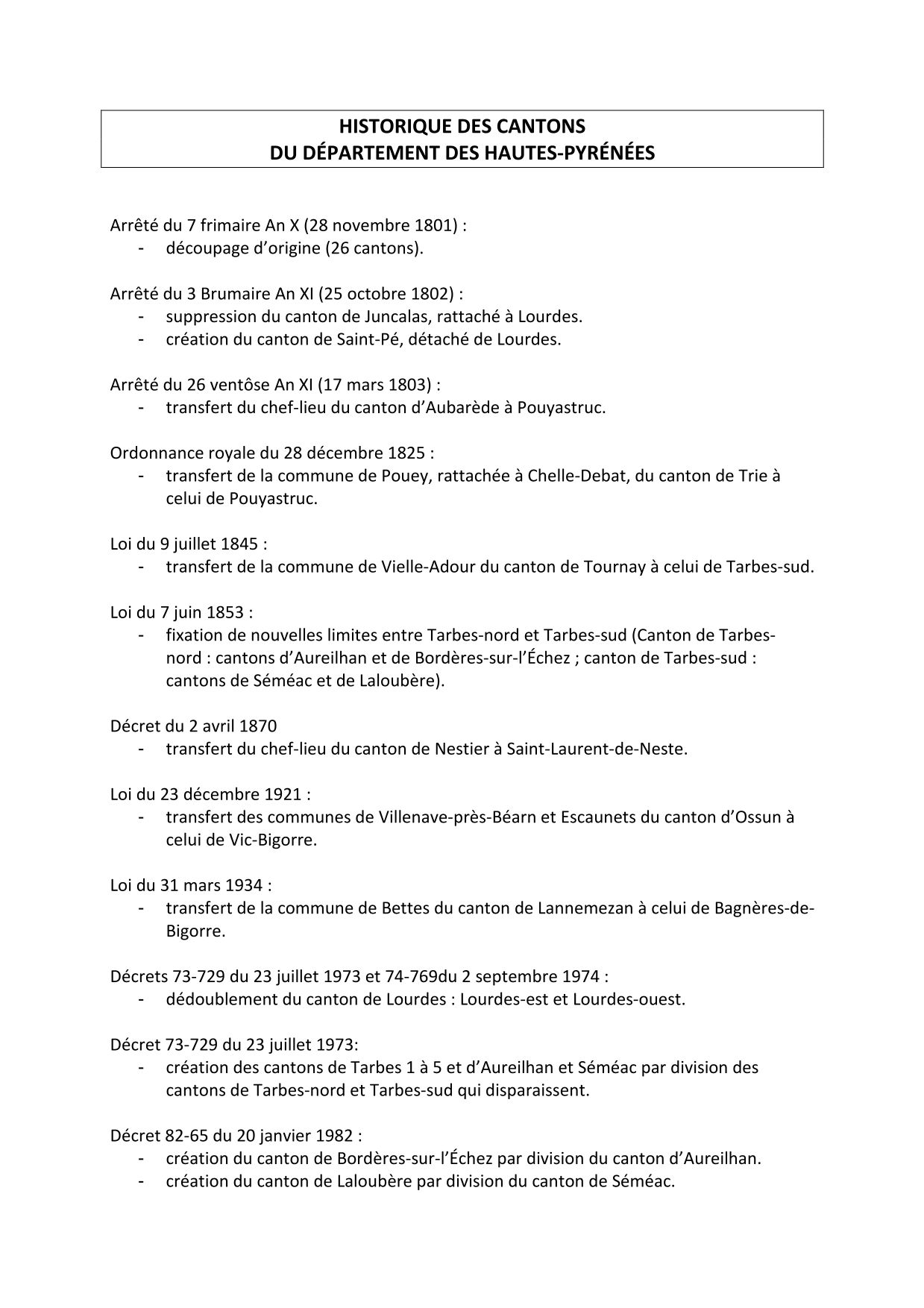 Conseil départemental des Hautes-Pyrénées Historique des cantons des Hautes-Pyrénées (37.3 Ko) Présidents du Département des Hautes-Pyrénées (40.8 Ko) Conseillers généraux et départementaux par canton (90.0 Ko) Ressources disponiblesPlan cadastral (2)Atlas cantonal (1)Carte départementale (1)Registre de délibérations (24)