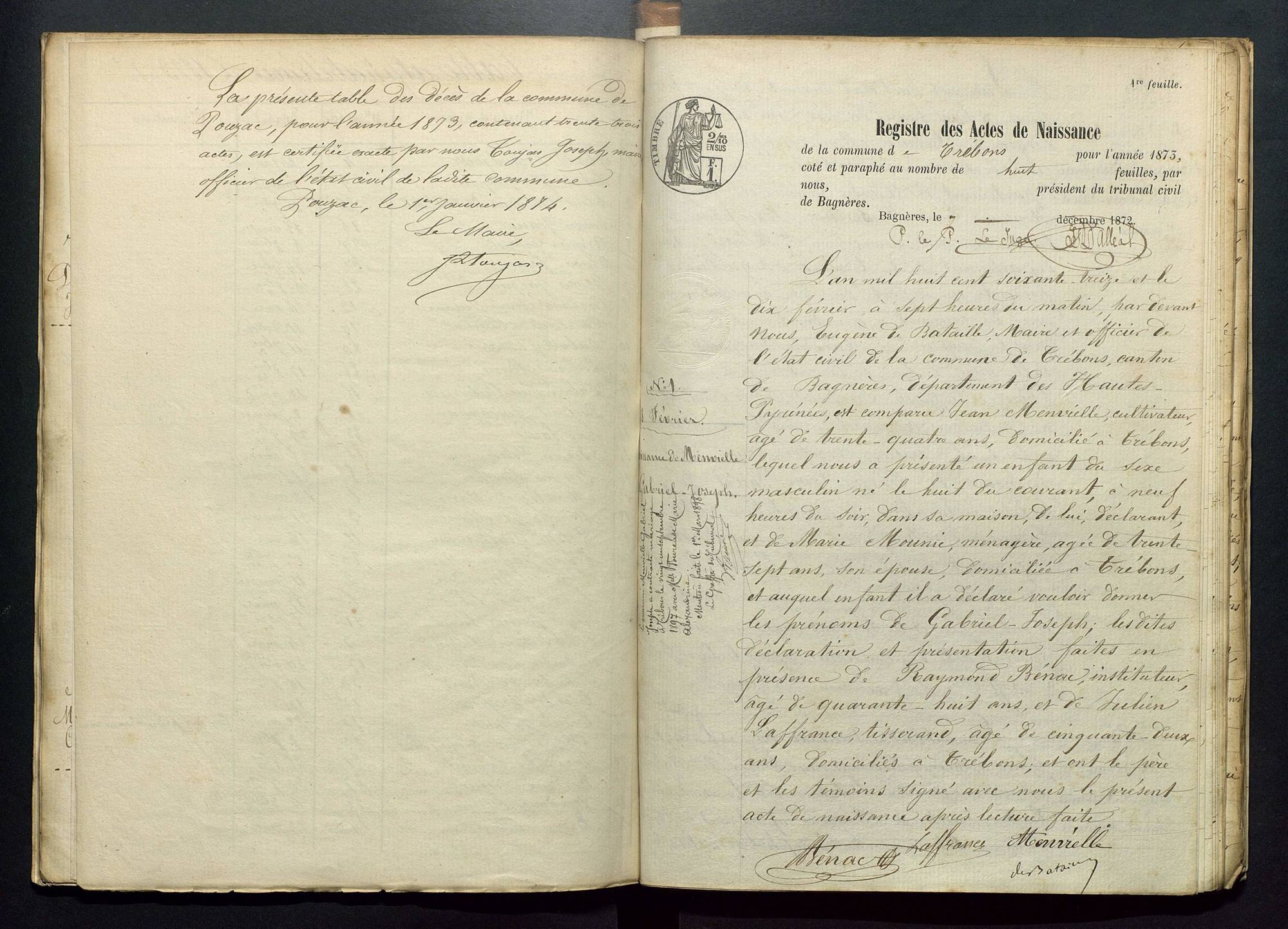 Naissances, mariages et décès de Trébons 1873 Type de document Etat civil Cote 2 E 3/802 Lieu de conservation Archives départementales des Hautes-Pyrénées Collection collection départementale