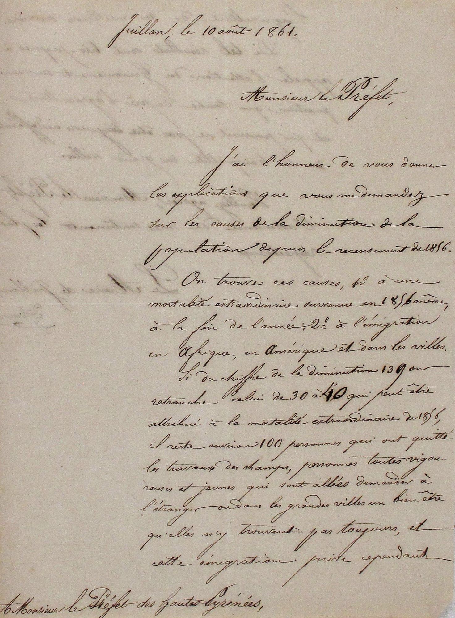 Au XIXe siècle, les Hautes-Pyrénées traversent une grave crise démographique : entre 1851 et 1911, le département perd 50.999 habitants passant de 249.234 à 198.235 individus. Outre la baisse de la natalité, cette chute de population s’explique par l’exode rural et l’émigration. Ces phénomènes touchent en effet toutes les communes haut-pyrénéennes comme en témoigne l’enquête menée auprès des maires en 1861.