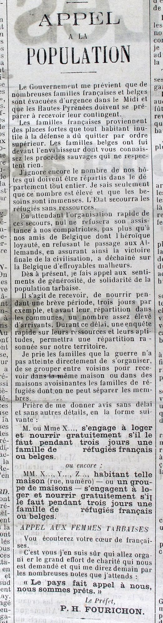 Néanmoins, ces mouvements demeurent limités au regard du nombre de réfugiés qui rejoignent les Hautes-Pyrénées dès l’été 1914 : des milliers de Français du Nord et de l’Est ainsi que des Belges cherchent en effet à échapper aux bombardements et à l’avancée des troupes allemandes en prenant la direction du sud de la France, des Pays-Bas ou de l’Angleterre. Face à l’importance de ce mouvement, le gouvernement français adopte des mesures et s’efforce de les répartir sur l’ensemble du territoire, en particulier dans le Midi et le Sud-Ouest.