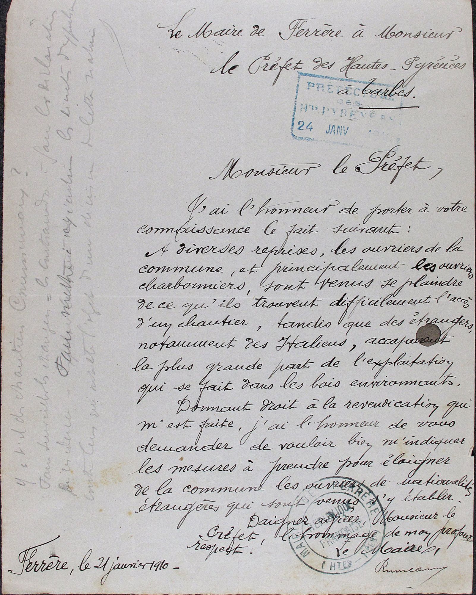 Tous originaires de la province de Pistoïa (Toscane) et organisés en réseaux, ces hommes finissent par s’attirer la jalousie des locaux. Ainsi, en 1910, le maire de Ferrère fait part au préfet des plaintes des ouvriers charbonniers de la commune concernant leurs difficultés à travailler sur les chantiers proches alors que « les étrangers notamment italiens, accaparent la plus grande part de l’exploitation qui se fait dans les bois environnants ».