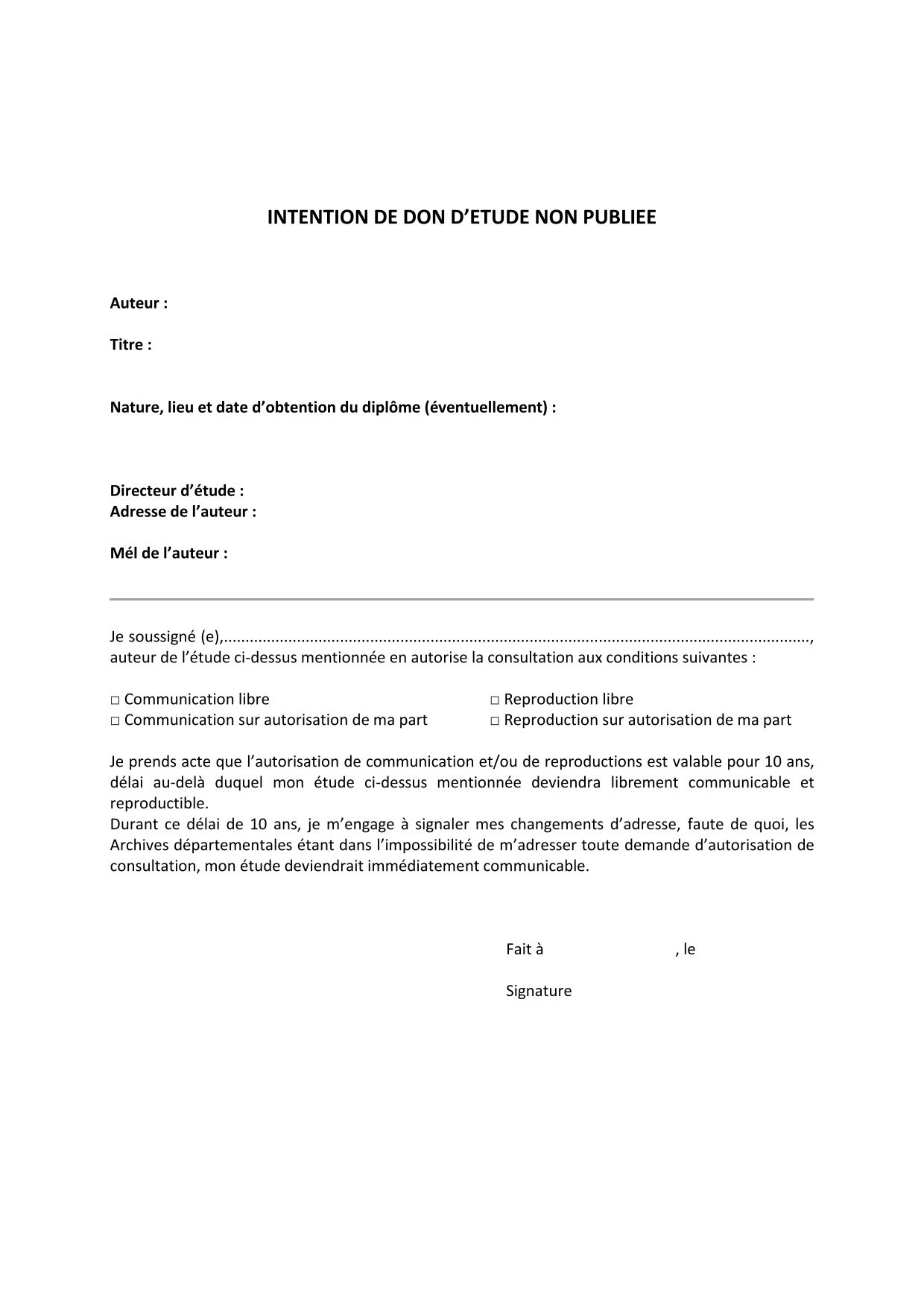 Pour faire don d’une étude ou d’un mémoire, il vous suffit de compléter le formulaire téléchargeable ci-dessous, en précisant les conditions de communication de votre mémoire (nous contacter pour tout renseignement).