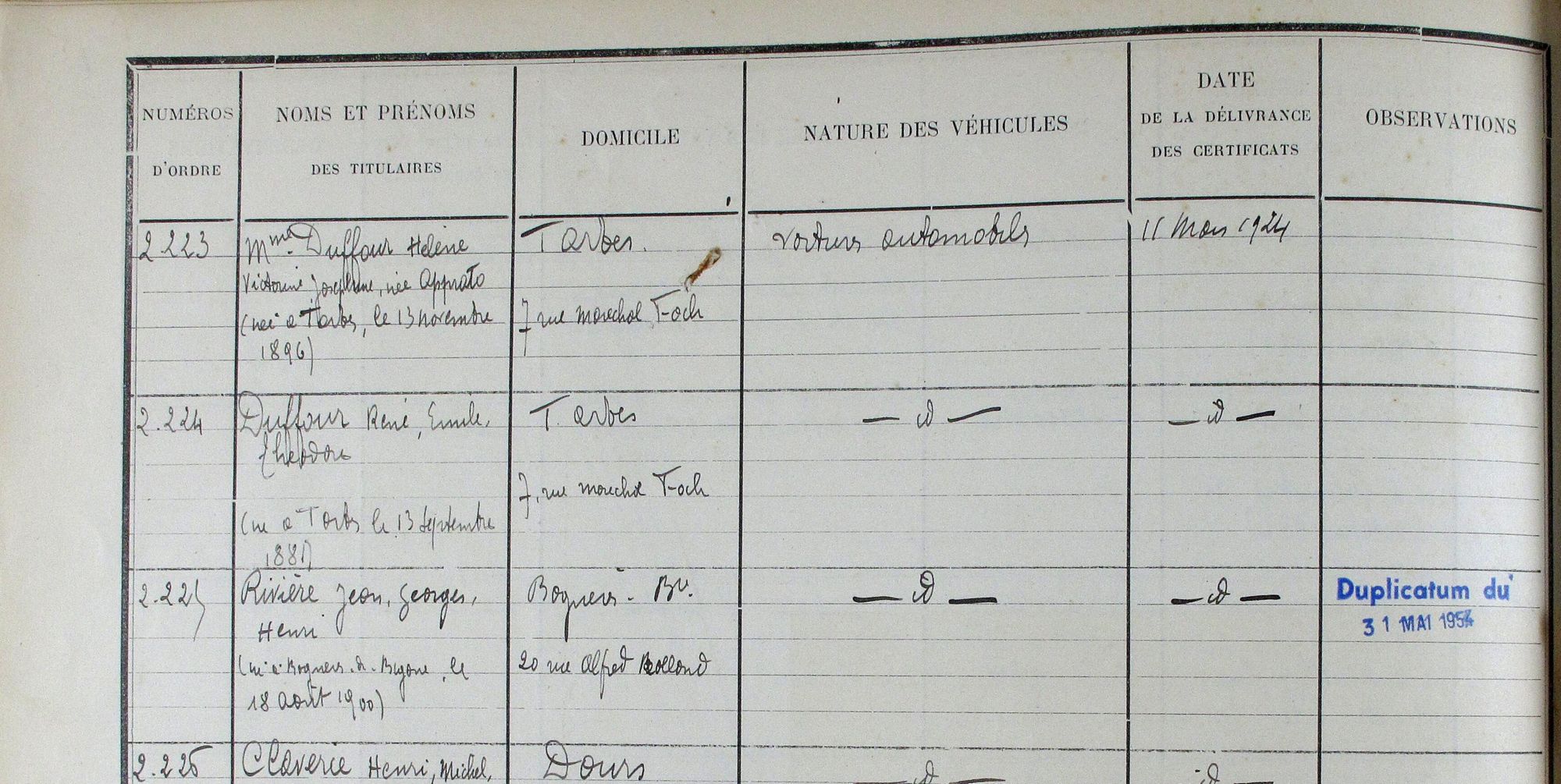 Par sa mission de collecte des documents produits par la préfecture, le service des Archives départementales conserve aujourd’hui une riche documentation sur le permis de conduire, en particulier les registres d’attribution du certificat de capacité et du permis de conduire à l’image de l’illustration : cet extrait datant de 1924 renseigne en effet sur les nouveaux conducteurs parmi lesquelles figurent plusieurs conductrices.