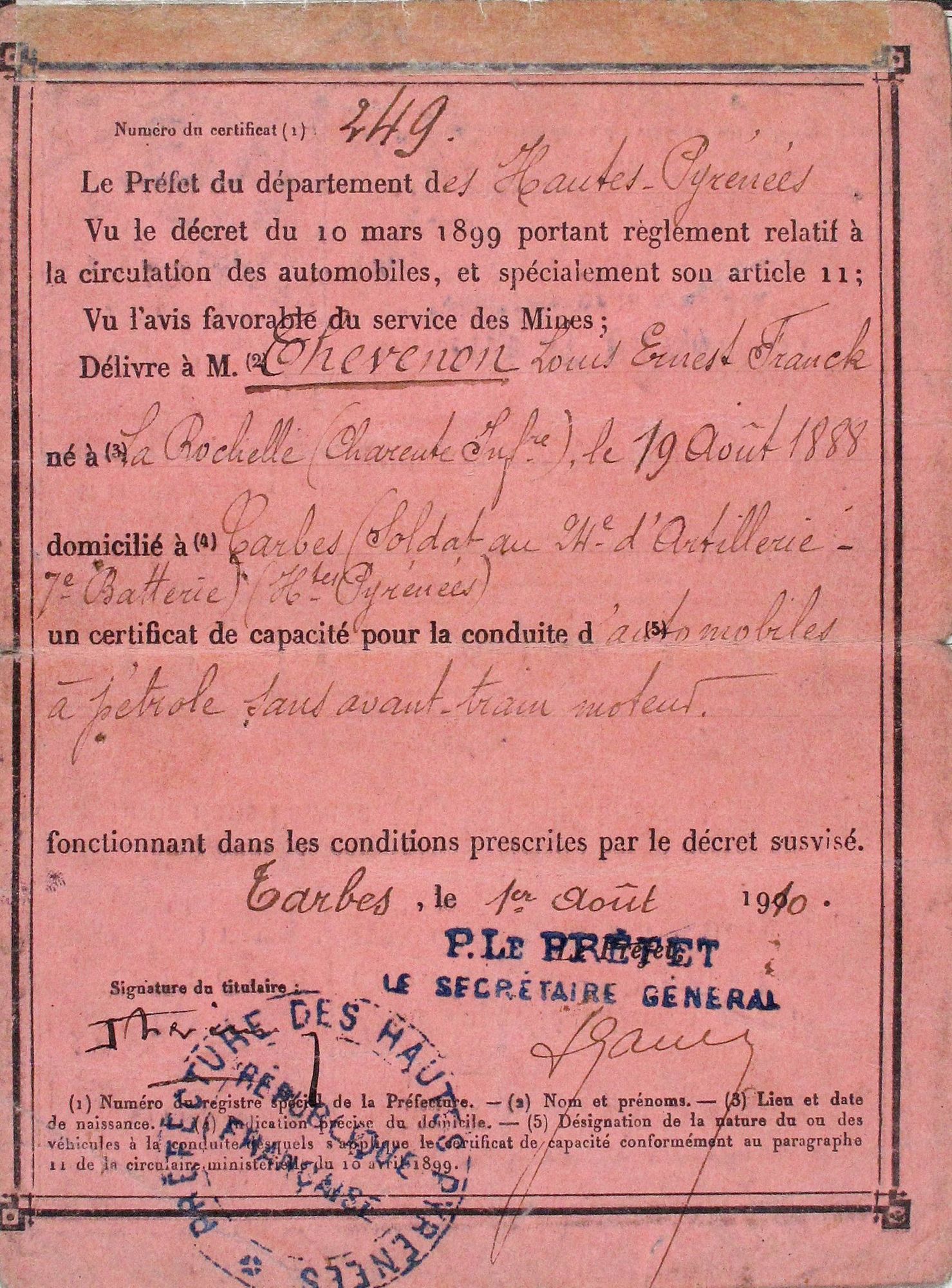 Par décret du 31 décembre 1922, est instauré le permis de conduire. A compter de cette date, « nul ne peut conduire un véhicule automobile s'il n'est porteur d'un certificat de capacité délivré par le préfet du département de sa résidence, sur l'avis favorable d'un expert accrédité par le ministre des Travaux publics. Ce permis ne pourra être délivré à l'avenir qu'à des candidats âgés d'au moins 18 ans. Il ne pourra être utilisé pour la conduite soit des voilures affectées à des transports en commun, soit des véhicules dont le poids en charge dépasse 3.000 kg, que s'il porte une mention spéciale à cet effet. »