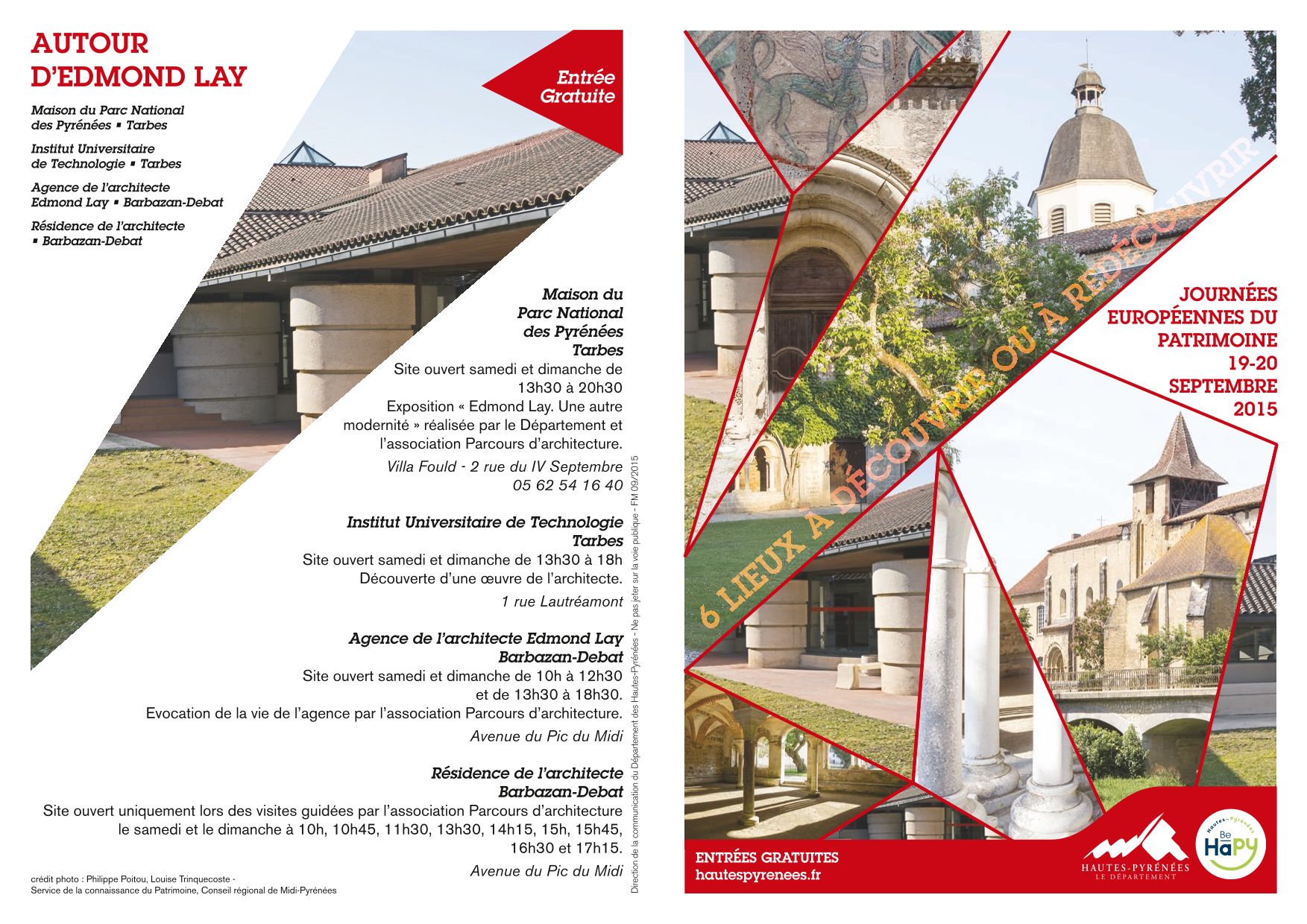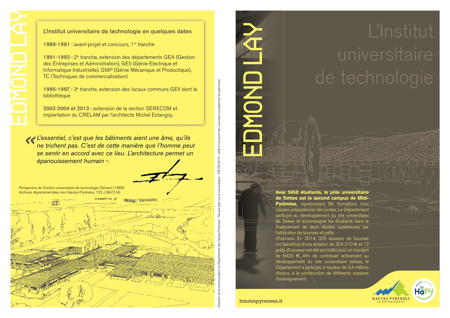 Tout d’abord par la présentation de l’exposition Edmond Lay, une autre modernité du 1er juillet au 15 novembre 2015 au Parc national des Pyrénées à Tarbes, puis par l’ouverture de l’IUT le samedi 19 et le dimanche 20, afin que le public découvre l’une des œuvres de l’architecte.