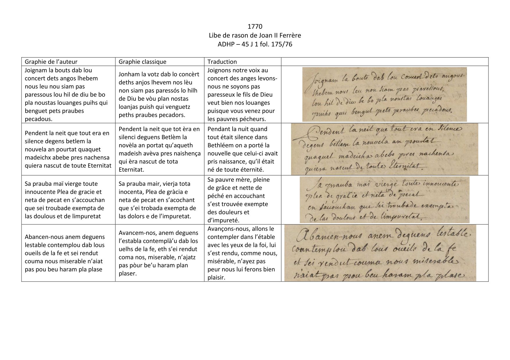 Depuis le XVIIème siècle la création de Noëls est à la mode dans l’ensemble des pays occitans. De nombreux recueils sont publiés et les textes circulent. Le noël noté par Jean Ferrère est une création de son époque, orthographié selon la norme de son temps. Jean parlait gascon mais il en connaissait également l’écrit, bien que la transmission institutionnelle de l’écrit occitan ait cessé dans la majeure partie du territoire à la fin du XVIème siècle. On remarquera que si le noël est écrit dans une forme standard de gascon, avec en particulier l’usage des articles définis lo et la, Jean Ferrère laisse les formes de son parler familial faire irruption avec l’usage de la forme montagnarde eth : « lo concèrt deths anjos ».