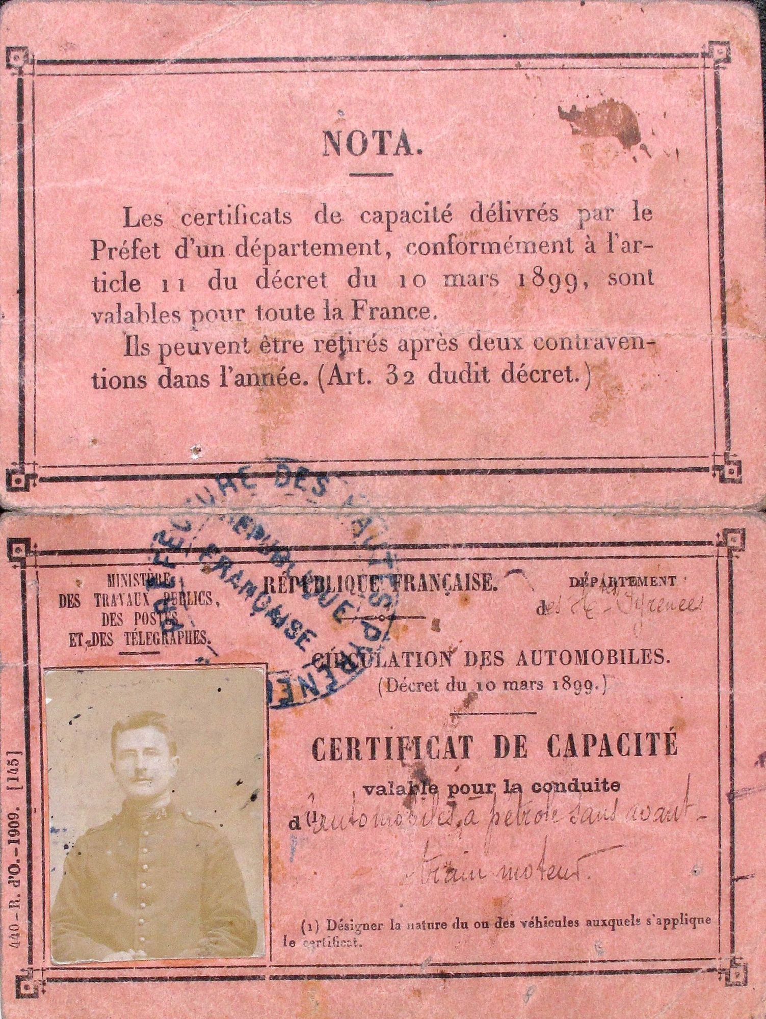 Par décret du 31 décembre 1922, est instauré le permis de conduire. A compter de cette date, « nul ne peut conduire un véhicule automobile s'il n'est porteur d'un certificat de capacité délivré par le préfet du département de sa résidence, sur l'avis favorable d'un expert accrédité par le ministre des Travaux publics. Ce permis ne pourra être délivré à l'avenir qu'à des candidats âgés d'au moins 18 ans. Il ne pourra être utilisé pour la conduite soit des voilures affectées à des transports en commun, soit des véhicules dont le poids en charge dépasse 3.000 kg, que s'il porte une mention spéciale à cet effet. »