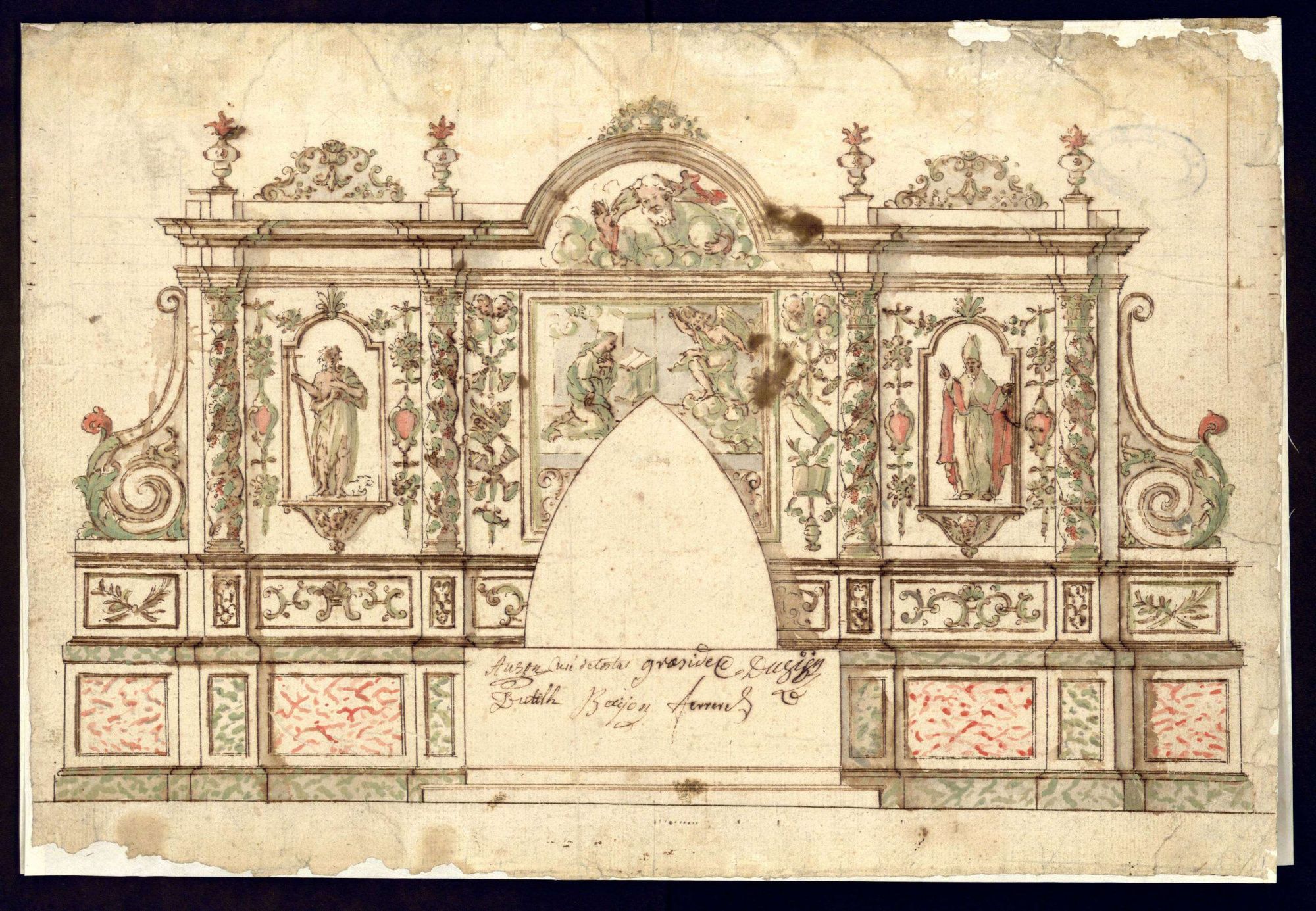 Le fonds iconographique Ferrère (17 Fi) est composé d’une petite collection de dessins à la plume, au lavis ou au crayon de mobilier religieux du XVIe au XIXe siècles. Ils sont en partie l’œuvre d’une famille de menuisiers sculpteurs d’Asté, les Ferrère (Marc, Jean II et Dominique) connus pour avoir réalisé des retables baroques, du sculpteur toulousain Pierre Affre, Marc Arcis et du bagnérais Jean-Pierre Menvielle. Témoignage incontestable de la richesse du patrimoine religieux des Hautes-Pyrénées, cet ensemble appartient au diocèse de Tarbes et Lourdes jusqu’à 2011, alors conservé au Grand Séminaire de Tarbes, et depuis déposé aux Archives départementales des Hautes-Pyrénées. Les références mentionnées dans la notice de chaque dessin renvoient à l’étude de Françoise-Claire Legrand publiée en 1976 (cf. bibliographie).