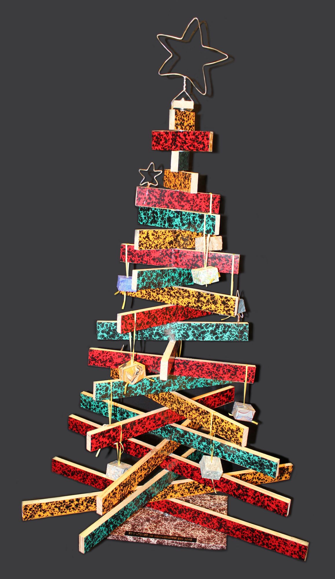 Les décorations, en forme de cadeaux, ont été confectionnées à l'aide de débris des liteaux et emballées de papier marbré.