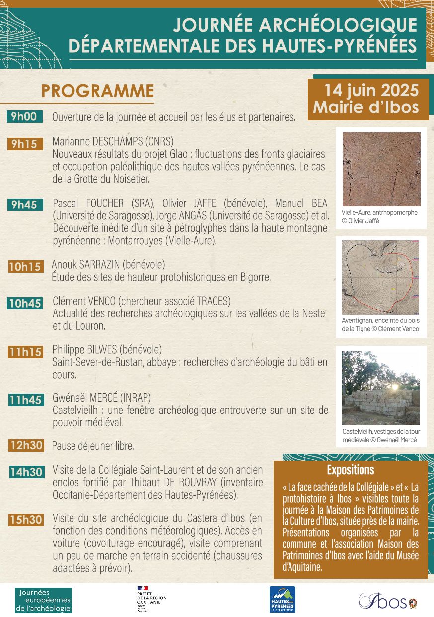 Dans le cadre des Journées européennes de l'Archéologie, le Département des Hautes-Pyrénées, le Service régional de l'Archéolgie (SRA) et la commune d'Ibos co-organisent conférences, visites de terrain et expositions, le samedi 14 juin, à partir de 9 heures à la mairie d'Ibos.