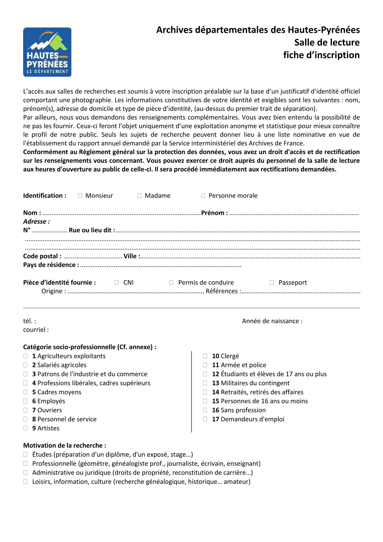 La salle de lecture des Archives départementales est ouverte à tout citoyen, quels que soient son âge et sa nationalité. L’inscription est gratuite, sur présentation d’une pièce d’identité en cours de validité (carte nationale d’identité, passeport, permis de conduire), après avoir complété un formulaire d’inscription. L’inscription est valable pour l’année civile en cours.