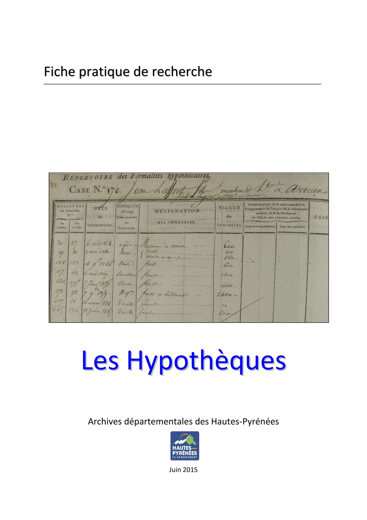 En raison de la mise en ligne des registres d’ordre produits par la Conservation des Hypothèques, les Archives départementales des Hautes-Pyrénées ne répondent plus aux demandes de relevés de formalités hypothécaires. Vous disposez en effet de toute la documentation utile pour mener à bien cette recherche.