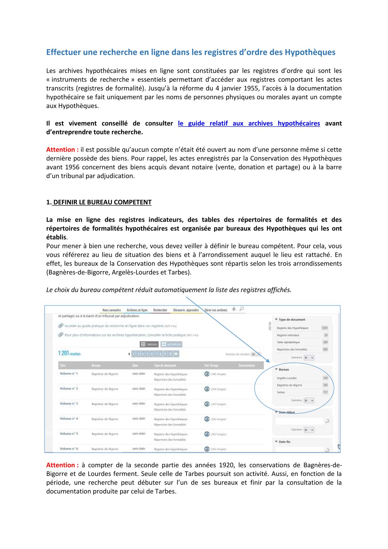 Les Archives départementales des Hautes-Pyrénées conservant la documentation hypothécaires pour la période de l'an VII jusqu'en 1955. Au delà de cette date, le demandeur doit s'adresser au Service de la publicité foncière (05.62.44.40.66 / spf.tarbes1@dgfip.finances.gouv.fr).